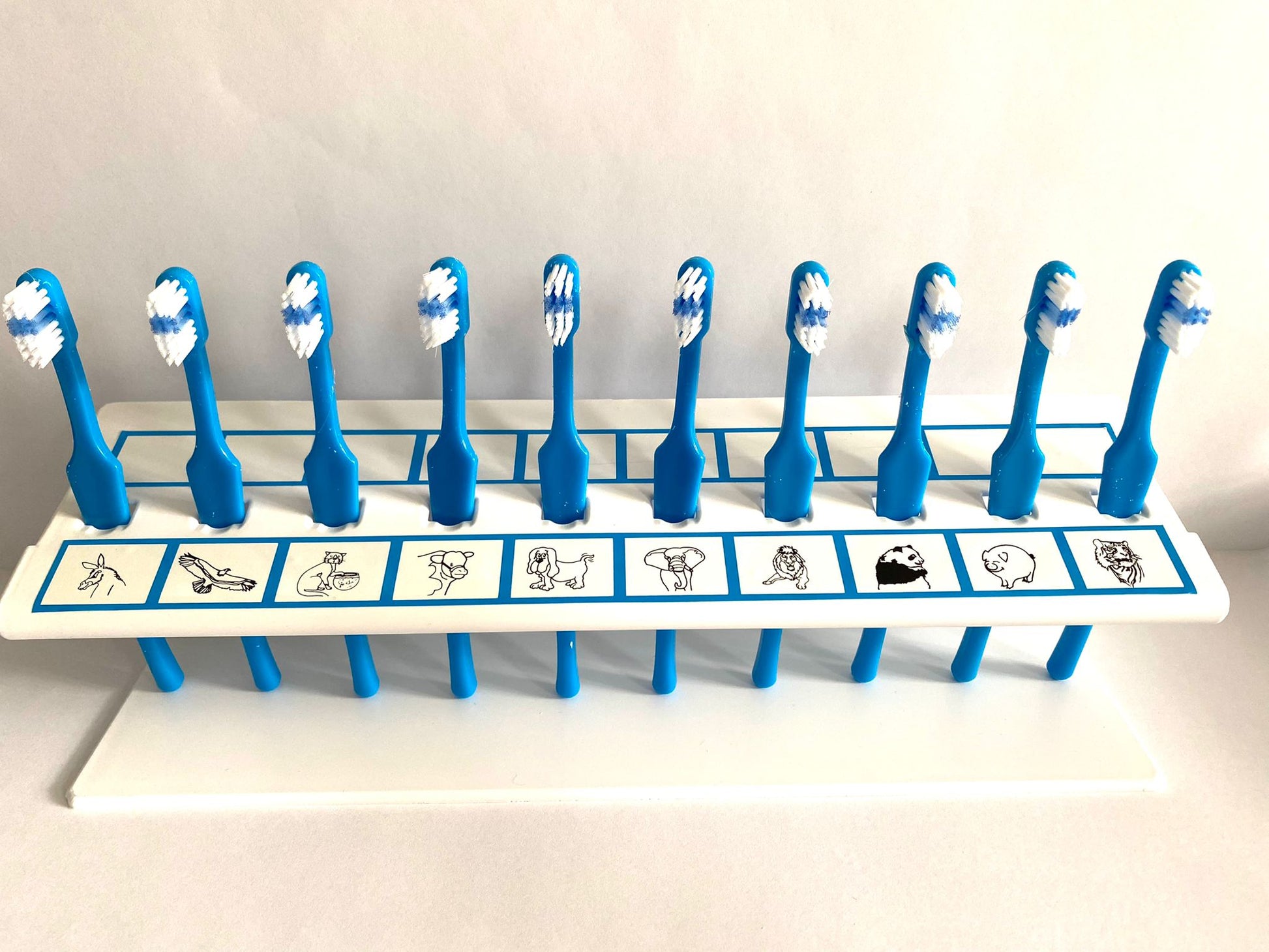 Holds 10 toothbrushes, uses pictures of ANIMALS for toothbrush identification, each purchase includes a cover.